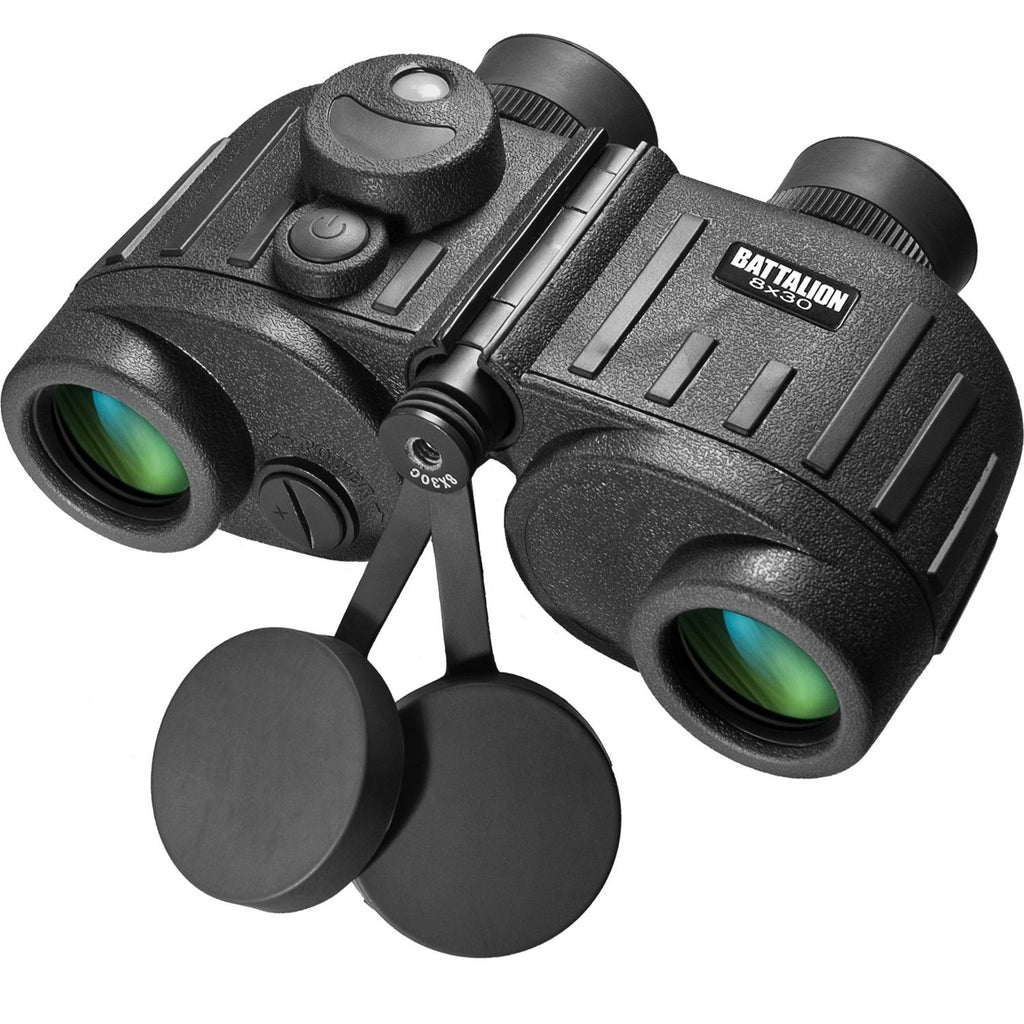 The Barska 8x30 WP Battalion Binocular w/Internal Rangefinder and Illuminating Directional Compass is designed to meet military standards. Whether you're ashore or on the water, this binocular is designed to perform in the most demanding conditions. The internal rangefinder allows the user to easily obtain a distance between an object. The intergraded compass features an illuminated red light for viewing the internal compass in low light conditions. 100% water proof and fog proof to avoid moisture damage. With fully multi-coated optics and BAK-4 prisms gives crisp images and lets more light in. The Porro prism system offers greater depth perception and a wider field of view. Has individual eyepiece focus for customization of viewing. Fold down eyecups to use with eyeglasses. All Battalion binoculars are rubber armored for shock protection and a comfortable secure grip. Compass does not operate in southern hemisphere.