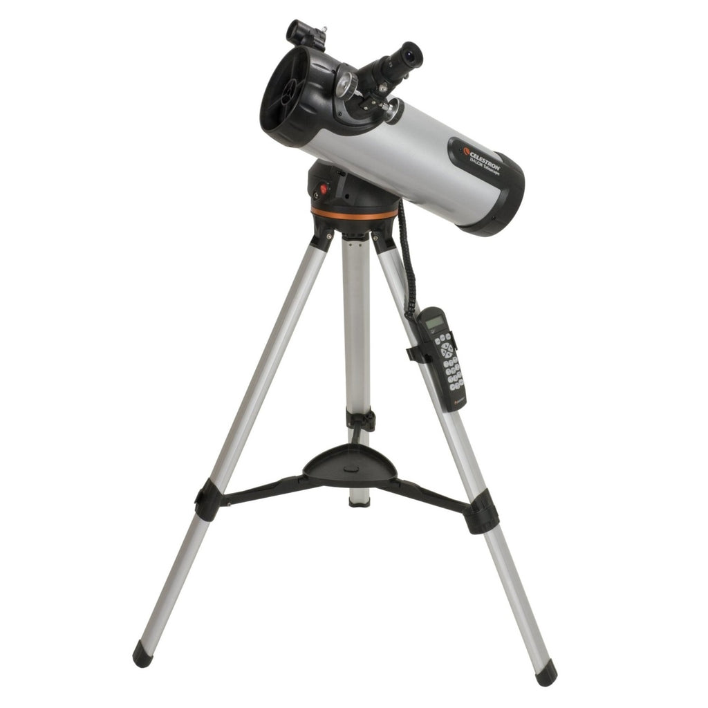 Celestron 114LCM Computerized Telescope offers the same star locating technology found on our observatory-grade telescopes at a price that fits your family's budget. Leave the star maps at home. The 114 LCM computerized telescope can locate thousands of celestial objects for you automatically. To get started, just perform our simple SkyAlign alignment procedure by centering any three bright objects in your telescope's eyepiece. From there, your LCM can calculate the time, date, and location and orient itself with the night sky. Browse the hand control's database and select any star, planet, galaxy, or nebulae in the database. Within seconds, your LCM centers it in the eyepiece and tracks it as it moves across the sky. Looking for something to observe? Press the Sky Tour button and your LCM generates a list of the best celestial objects currently visible. With the largest optics in the LCM beginner telescope family, the 114LCM packs enough light-gathering ability to provide extraordinary views of all the best celestial objects. Explore our Solar System, from the moons of Jupiter to the rings of Saturn and beyond. Then venture further into deep space to view the Orion Nebula, Pleiades Star Cluster, and hundreds of other objects. You can even explore the craters of the Moon up close, with impressive detail. Even if you've never used a telescope before, Celestron makes it easy to get started with amateur astronomy. Your LCM telescope comes with an adjustable aluminum tripod, 2 high quality eyepieces, and a red dot finderscope. To enhance your experience under the stars, download Celestron's free SkyPortal app. Listen to hundreds of audio descriptions of the most popular objects on your iOS or Android device while you observe them with your LCM telescope.