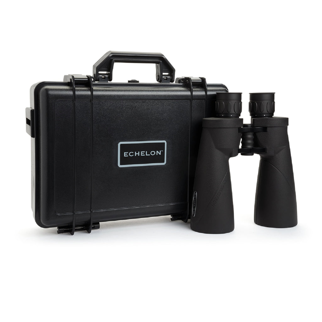 Celestron Echelon 10x70 binoculars were designed for use in low light conditions. Whether you are long-range glassing across a field or valley, or gazing at the night sky, a pair of Celestron Echelon binoculars will get the job done. With an exit pupil of 7 mm, these binoculars deliver the maximum amount of light your pupils can accept, allowing you to see the most detail possible. The Echelon 10x70 offers the lowest magnification of any Echelon model, giving it the widest field of view. Choose this model if you want a high-power, large-aperture binocular, as they will make it easiest to acquire and follow your subject. The 10x model is also a great choice for viewing large swaths of the night sky, comets, the Milky Way, and more. Celestron Echelon binoculars sport high quality 70 mm objective lenses and superior BaK-4 prisms were chosen for maximum contrast and sharpness. All air-to-glass surfaces are multi-coated with Celestron's proprietary XLT optical coatings-the same high transmission coatings used on our observatory-grade telescopes to increase contrast and resolution. Celestron Echelon binoculars are manufactured using quality Japanese optics and are assembled by hand by skilled technicians in Southern California. Each Echelon binocular housing is made of aluminum alloy, keeping it strong yet lightweight, an important factor when considering a big binocular purchase. Durable rubber armor covers the aluminum housing for a slip-free grip and protection against the occasional bump or ding. These binoculars are fully waterproof and are nitrogen-purged to seal the optics against fog, dew, and other forms of moisture. This means you can use your Echelon binocular in damp conditions without having to pack up and call it a day when unexpected weather makes an appearance. Echelon binoculars come with a high quality waterproof hard case for ultimate protection against dust, moisture, and rough handling. A molded foam insert cradles the binoculars nicely, keeping them safe and sound no matter where your journeys take you! Echelon binoculars use an individual eye focus system, enabling you to rotate each eyepiece to set the proper focus for your right and left eye. Once set, you should be able to use your binoculars at a moment's notice and focus sharply at infinity, the normal distance desired for long-range observations. Should you wish to share your binocular with others, it is fast and simple to adjust the focus for their vision requirements. The Celestron 10x70 Echelon Binoculars have 21.5 mm of eye relief, making them comfortable for all users, whether they wear eyeglasses or not. The rubber eyecups position your eyes at the best distance from the optics for a full field of view. Echelon binoculars are easily attached to a photographic tripod for extended observing sessions. A binocular tripod adapter (sold separately) is used to make the connection between the binoculars and a standard tripod, and is especially helpful for vibration-free observations of the night sky.