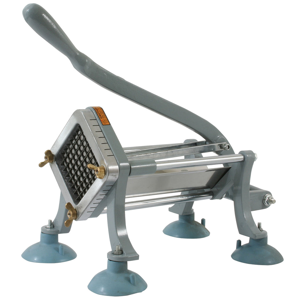 Cut homemade french fries for the entire family in minutes with the Sportsman Series Commercial Quality French Fry Cutter. This cast iron French Fry Cutter mounts to a wall, counter or tabletop to cut potatoes up to 6 inches long into 3/8 or 1/2 inch wide strips. Two stainless steel cutting attachments are included, one for thick and one for thin cut fries. In no time at all, you can cut enough potatoes to feed the entire family. You can even make sweet potato fries to bake as a healthier option. . The French Fry Cutter can cut fruit and veggies too, making them more fun for kids to eat. Cut carrots, zucchini, cucumbers, pineapple, and sweet peppers into thin strips that little hands can easily grab. Suction cups are included to give the French Fry Cutter stability on countertops and tabletops. The large, heavy duty suction cups bolt on so they stay put, or can be removed so the French Fry Cutter can be mounted permanently horizontally to a flat service or vertically on a wall. Cut homemade French fries for the entire family in minutes Cast iron body will last a lifetime, Mounts on wall or counter top Includes 2 stainless steel cutting attachments, 1 for thick and 1 for thin Cut potatoes up to 6 in. long into 3/8 in. or 1/2 in. strips, Cut fruits and vegetables too Can be mounted to a wall or tabletop, large heavy duty suctions cups included for stability on countertops Overall size: 19.5 in. L x 12 in. W x 8 in. H