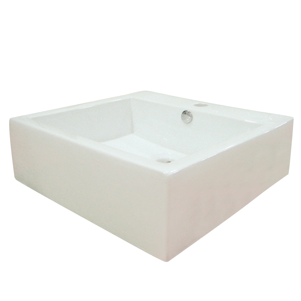 This vessel countertop wash basin stands tall with its 6 high deck shaped in a large square covering 18 around all four sides. Constructed with vitreous china material, the interior basin is expanded 4 inward with a rear-side overflow hole and a single-hole drilling on the faucet deck.
