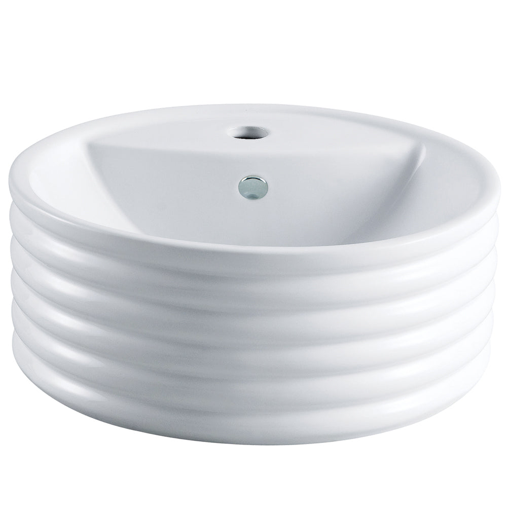 This unique white china vessel sink features a deep inner basin that descends 5-1/2". The outer portion is designed with an interesting circular multi-tier exterior. This bowl-like basin consists of soft curves and smooth contours and is made from the finest vitreous china material, made to prevent from scratching or chipping.