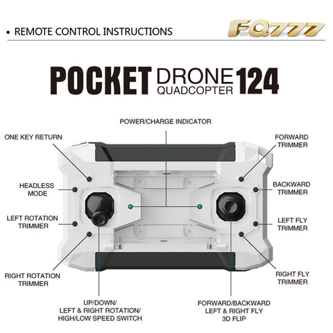 Feature: 100% brand new and high quality. The MINI POCKET DRONE is set up with CF mode(headless) and one key return, which shows this drone is well developed and considered. Unique printing and attractive color design,Small size allows you to fly indoor with limited space.The MINI POCKET DRONE special designed controller is also a storage box for the drone and spare parts.The special controller can achieve: carry the drone/carry spare parts/recharge the drone, also it can be put in your pocket. Therefore, you can enjoy flying this mini drone anywhere & anytime. Controller is designed with MODE1/MODE2 one key swith, which allows everyone to play this drone, no matter you are mode1er/mode2er. Rotor protector is included, as well as landing gears, which are double protection for the rotors and motors, also avoid anyone to get injury. Controller includes a charging cable allows you to charge the drone by batteries in the controller. Also USB cable is available. Lipo battery built-in charge and discharge protection, while powerful motors performs perfect fliping.Point: MINI POCKET DRONE with CF mode (headless): a function through which the aircraft will consider the direction opposite to that of the remote control as the correct one by default when it flies to a height where the operator is not able to judge the direction of the aircraft head with bare eyes, so that he/she can go on with the remaining positions. One key return: auto return of the aircraft after GPS positioning on the basis of signals emitted by remote control while it is hovering in good condition, saving the operation from redundant manipulations Unique printing, attractive design, mini size which allows for indoors or limited space flight MINI POCKET DRONE customized controller: functions as a storage box for the drone as well as spare parts. The pocket-sized dedicated controller: able to carry the drone/carry spare parts/recharge the drone MODE1/MODE2 one key to switch: allows everyone to play it, no matter you are mode1er or mode2er Rotor protector, landing gears included: for protection of rotors and motors, preventing any operator from accidental injuries Controller equipped with a charging cable: allowing for charge by batteries in the controller USB cable accessorized Built-in Lipo battery: features over-charge/discharge protection, while the powerful motors performs inpeccable flipingDescriptions: Model FQ777-124 Color:White Recharging Time 20mins Battery For Quadcopter 3.7V 100 mAh/25C(included) Battery For Transmiter 4 x AA Battery (not included) Camera:N/A AV Transmitter:N/A Notice For the first time, please fully charge it Installing the landing gear after adjusting the frequency to ensure the gyroscope calibrate accurately Dimensions & Weight (Main Product) Dimension Quadcopter Size: 7x7x2.7cm Controller Size: 14x8.5x4.1cmFunction: MODE1&MODE2 switch CF mode (headless mode) one key return 360rolling actionNotice: For the first time use please full of electricity.Suggestions in the installation of the landing gear after adjust the frequency so that can ensure the gyroscope can accurate calibration.Use suggest: 1. turn on the drone, drone flashing 2. turn on the transmitter("di" ), light flashing too 3. wait about 2 seconds, the drone and transmitter stop flashing ("di") 4. turn the throttle lever up and down, then sync ok (up will have "di" down also have "di" )Package Included:(With Retail Package) 1 x FQ777 mini pocket drone(included a 3.7V 100 mah/25C Li-po battery) 1 x Remote Control Transmitter 8 x Propeller(2sets) 1 x Rotor protector 3 x Landing gear (motor protector) 1 x Instruction manual 1 x Quadcopter Battery USB Charger