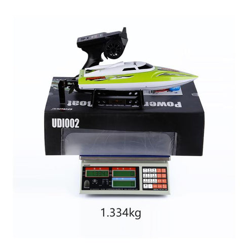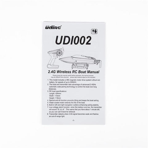 Features: 100% brand new and high quality It adopts 2.4G radio 2.4 G wireless automatic frequency pairing technology to pair frequency and assign ID automatically. Its appearance design meets the requirement of Human Engineering and easy to handle. The trim button is designed to adjust flight attitude and the LCD display screen can show complete fight data. 2.4G wireless technology features quick response, long control distance, excellent anti-interference performance, low power consumption and also supports multiple models competition. The UDI012 is a wireless racing boat that is fast, fun and easy to use. Its stylish design is nice to look at and it really performs for a boat of this size. This model includes a 390 magnetic motor drive system Lithium-ion battery, for speeds of up to 30KM/H. The boat and transmitter take advantage of advanced 2.4GHz automatic code pairing technology to control the boat over long distances. Being completely ready to run, it is great for both beginners and experienced boaters alike. The motor, ESC and steering servo are all pre-installed.Specifications: Model: UDI002 Navigation hours: 7-9 minutes Motor Model: RS390PM Indoor Hovering: Enabled by default Operating Temperature Rang: -10 - 40 C Main Color: Green Material: Plastic Suitable ages: Above 14 Years old Controlling distance: about 150m Speed: Up to 30KM/H Turning Radius: 2.5m Remote control frequency: 2.4GHz Battery for boat: 7.4V 1500mAh Battery Size: 69.5 * 38 * 19mm / 2.7 * 1.5 * 0.7in Charging time: about 200 minutes Transmitter battery: 4 * 1.5V AA batteries (not included) Size: 428 x 113 x 80mm/16.9 x 4.6 x 3.1 inch Package size: 473 x 320 x 140mm/18.6 x 12.6 x 5.5 inch Net weight: 836g Package weight: 1334gPackage Content:(with retail package) 1 * UDI UDI002 RC Boat 1 * Radio Controller 1 * USB Charge cable 1 * Propeller Unit 1 * 7.4V 1500mAh Battery 1 * Boat Holder 1 * User Manual (English) Caution: Don't over-charge, or over-discharge batteries. Don't put it in the high temperature condition. Don't throw it into fire.
