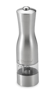 iTouchless EZ Hold Battery Powered Automatic Stainless Steel Salt and Pepper Mill is specially designed with an easy to grip contour that accommodates your hand. It is ideal for dinner parties featuring salads and steaks that taste better with fresh-ground pepper and sea salt. Just press the button on top and let the mill go to work. The stainless steel grinding mechanism can be adjusted from fine to coarse, and a light will illuminate when activating the mill to help with accurate portion control at dim environment. The nut underneath the mill controls the texture: turn clockwise for a finer grind, counterclockwise for coarser. Powered by 6 AAA batteries (not included)- Grinds pepper or salt electronically with the touch of a button- Elegant design with easy to hold contour with adjustable fineness- Guiding light illuminates automatically while dispensing - Stainless Steel construction with ceramic grinding mechanism- Powered by 6 AAA batteries (not included)