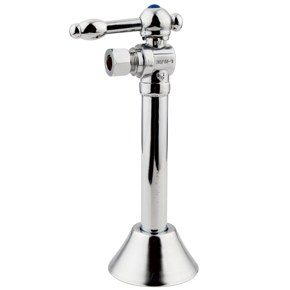 This -turn angle stop valve features a unique elegant lever which controls the movement of water through and from plumbing fixtures. The valve is connected to a long 5" extension is made of solid brass built for durability and dependability. Each product also comes in a variety of finishes to allow more than one option in decorating your kitchen/bathroom.
