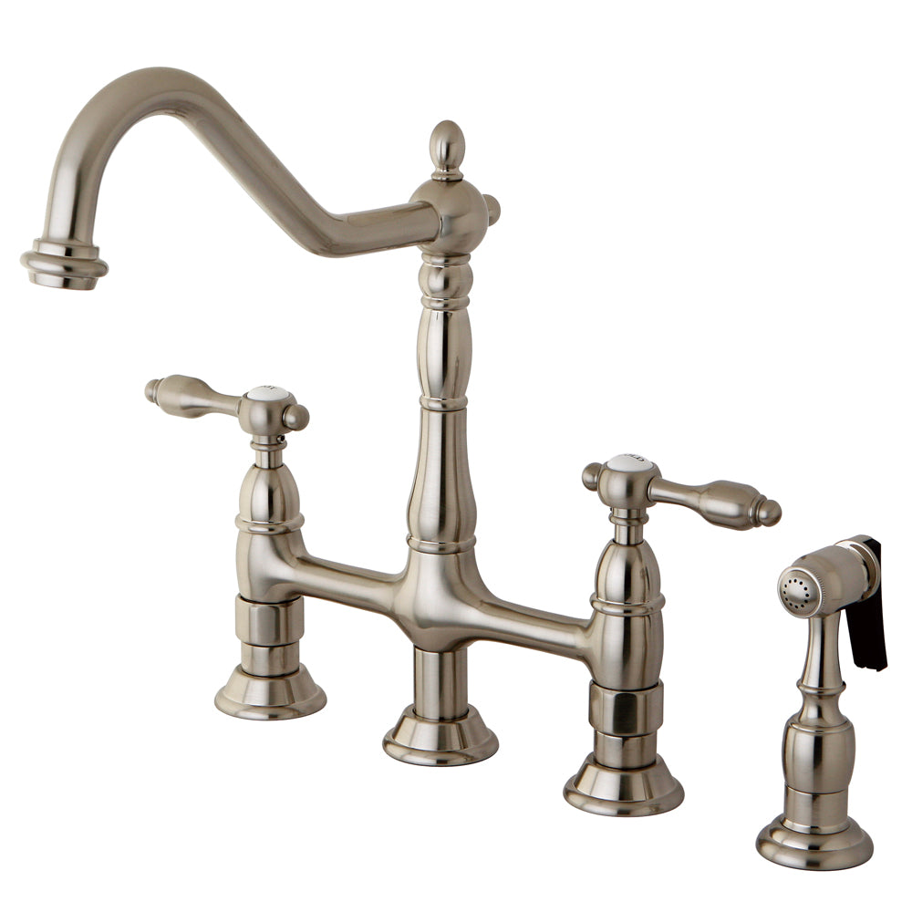 Nothing says traditional Vintage like this bridge kitchen faucet from The Tudor Collection from Kingston Brass, its Solid Brass spray will help you tackle any kitchen chore, equipped with a ceramic cartridge and fabricated in Solid Brass for Long Lasting performance, Satin Nickel