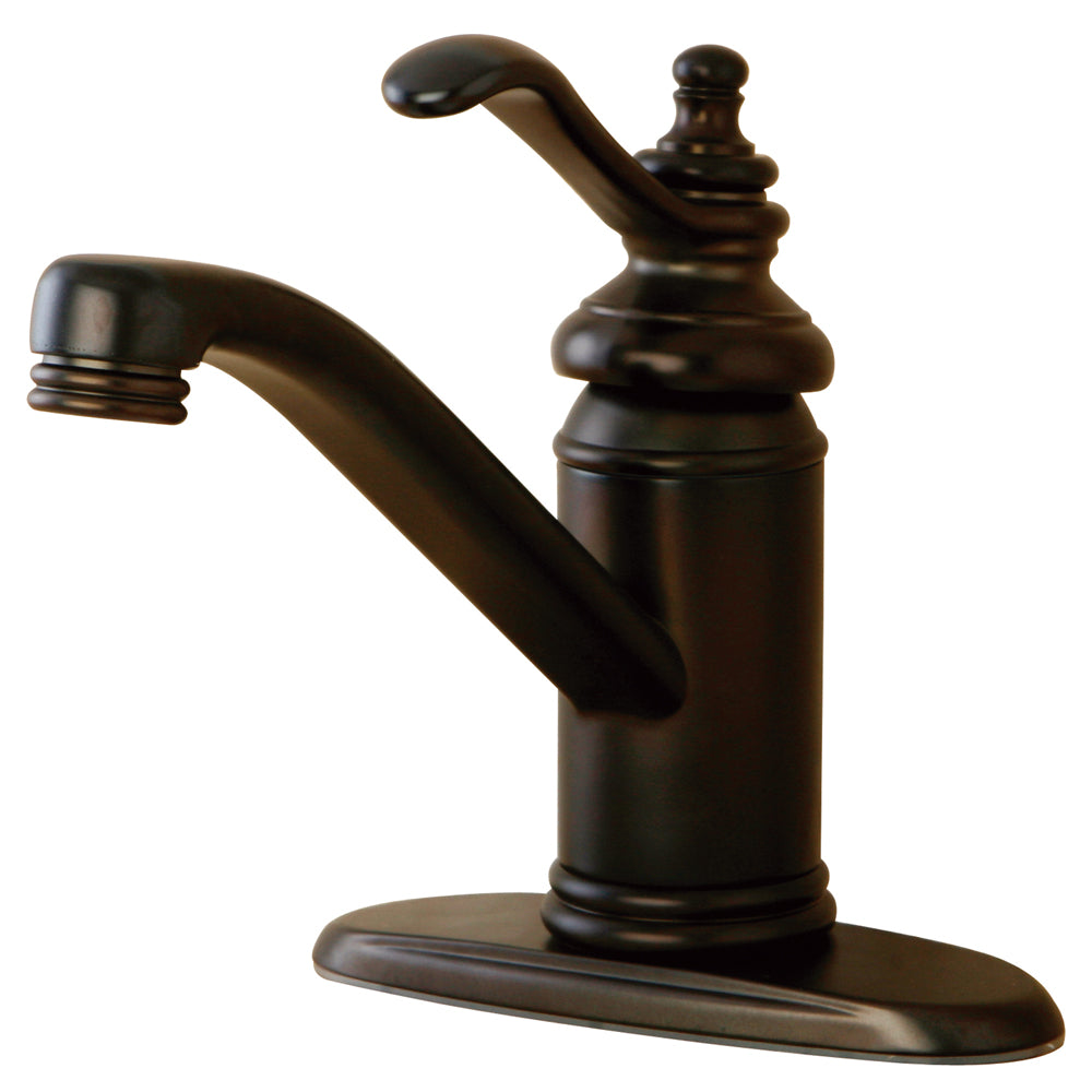 This faucet embodies all the traditional qualities of classic refined elegance. Its unique steeple-shaped design and hook-shaped spout will give your bathroom that one-of-a-kind look. This faucet has a deck mount setup and features a 4" centerset installation with optional deck plate. The body is fabricated from solid brass for durability and long-lasting use. The color finish is made of oil-rubbed bronze for dark, Vintage shade, as well as resisting scratches, corrosion and tarnishing. The spout has a reach of 6-3/4" and a height of 6". The handle allows for easy management of water volume and temperature. The faucet operates with a ceramic disc valve for droplet-free functionality with the water measured 1.2 GPM / 4.5 LPM and a 60 PSI maximum rate. An integrated removable aerator is inserted beneath the spout's head piece for conserving water flow. A push-up drain in a matching finish is included. All mounting hardware is included and standard US plumbing connections are used. A 10-year limited warranty is provided to the original consumer.