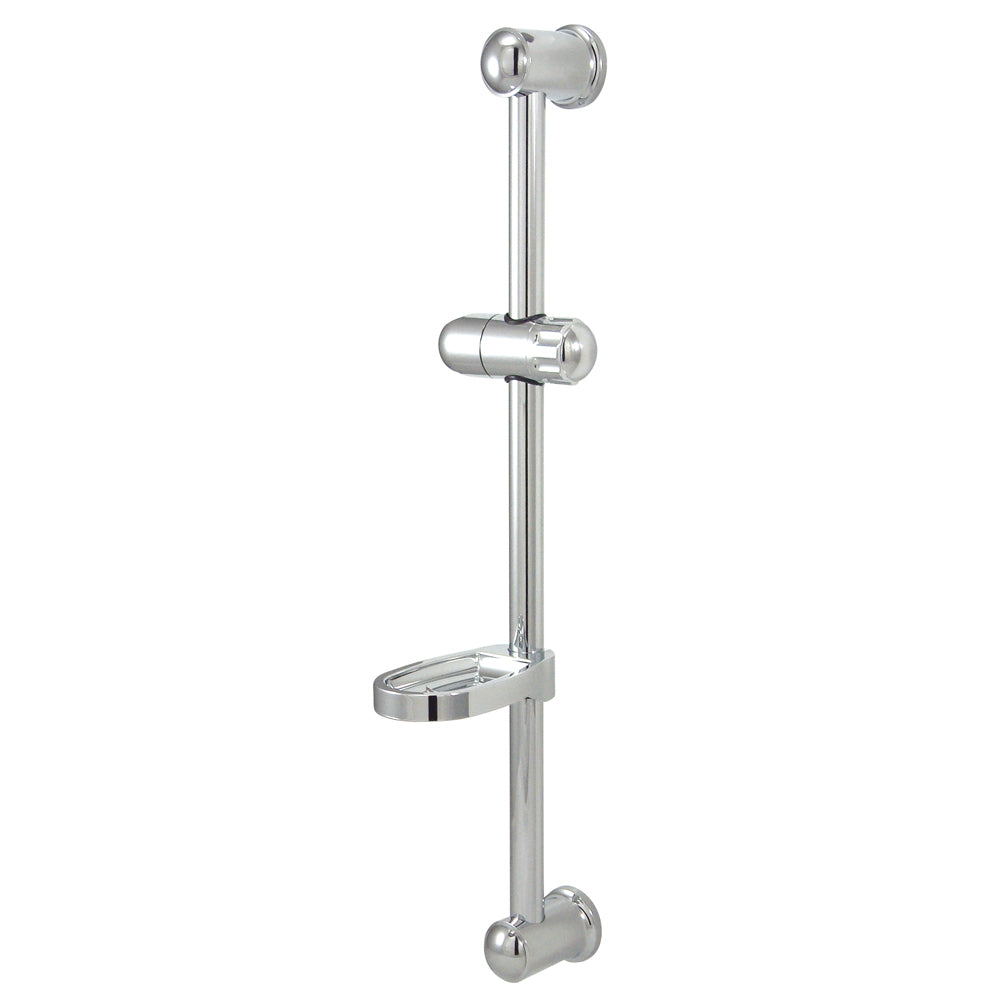 The shower slide bar with soap dish features an easy wall mount installation which includes a 24" adjustable slide bar, an oversized soap dish all engineered in grade ABS construction. Made from polished chrome