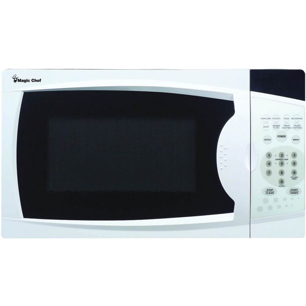 Magic Chef(R) MCM770W .7 Cubic-ft, 700-Watt Microwave with Digital Touch (White) .7 cu ft capacity; 700W; 10 power levels; Electronic controls with LED display; Express cooking functions; Kitchen timer/clock; Turntable; Weight & time defrost; 8 quick-set menu buttons; Child safety lock; White;